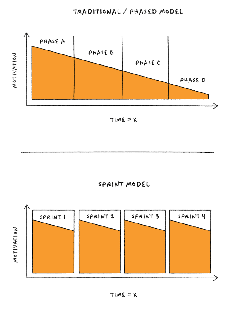 8. เคล็ดลับเวลาทำงาน คือใช้หลัก Sprint (ดูเพิ่มในรูป) คือ ให้แยกส่วนเป้าหมายใหญ่ให้เป็นเป้าหมายเล็ก เพราะจะช่วยลดความท้อใจหรืออ่อนล้าในการทำงานได้ เช่น หากเราทำ Excel ไม่เป็น ก็อย่าเพิ่งไปเริ่มที่ Pivot Table หรือ Power BI ฟังก์ชั่นยากๆ ให้เริ่มจากอันง่ายๆเบสิคๆก่อน คล่องแล้วก็ขยับไปทำอันที่ซับซ้อนขึ้น หรือในหนังสือ The Bullet Journal Method ก็มีพูดถึงเรื่องนี้เช่นกัน ยกตัวอย่างเป็นเรื่องการทำอาหารว่า ถ้าเราทำไม่เป็น อย่าเริ่มที่การทำซูเฟล่ยากๆ ถึงแม้เราจะทำตามสูตรจนสำเร็จ แต่ความกดดันอย่างหนักจะทำให้เรามีประสบการณ์ที่ไม่ดีซึ่งเสี่ยงต่อการสูญเสียความสงสัยใคร่รู้ในการทำอาหารโดยสิ้นเชิง คีย์ของเรื่องนี้คือ อย่าทำอะไรที่มันยากเกินไปจนสูญเสียความอยากรู้อยากเห็น ให้ทำแต่พอดี และค่อยๆดูพัฒนาการของตัวเอง