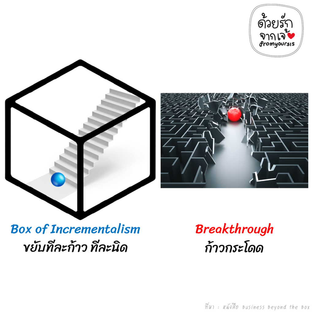 คอนเซปใหญ่ๆของตัว Business Beyond the Box นี้คือ การไม่ก้าวทีละนิด (Incrementalism) เพราะจะทำให้เราทำแบบเดิมๆ ผลลัพธ์ก็ไม่ต่างจากเดิม แต่ให้เปลี่ยนเป็นการก้าวกระโดด (Breakthrough) แทนซึ่งการจะก้าวกระโดด มีขั้นตอนใหญ่ๆ อยู่ 3 อย่าง ที่เปรียบเสมือนหัวลูกศร