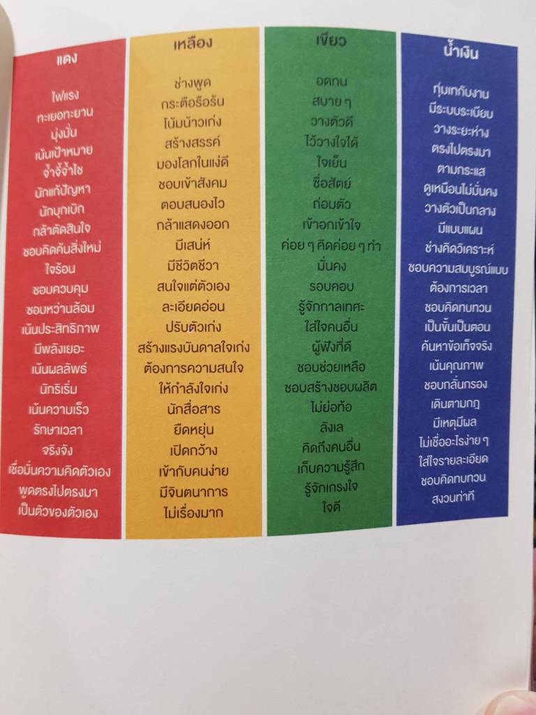 ซึ่งในเล่มมีพูดถึงการปรับตัวให้เข้ากับคนแต่ละสีที่ต้องเจอ มีการยกตัวอย่างสถานการณ์จริง คนที่เป็นสีนั้นจริงๆมาเสริม ทำให้เราเห็นภาพได้ชัดเจนมากขึ้น